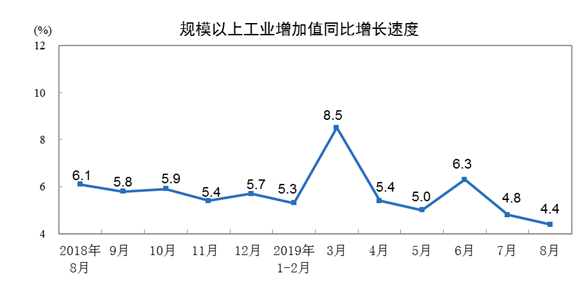 2019年8月份,规模以上工业增加值同比实际增长4.4%(以下增加值增速均为扣除价格因素的实际增长率),比7月份回落0.4个百分点。从环比看,8月份,规模以上工业增加值比上月增长0.32%。1—8月份,规模以上工业增加值同比增长5.6%。