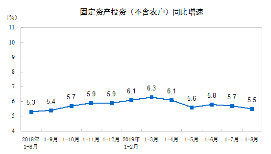 2019年1—8月份,全国固定资产投资(不含农户)400628亿元,同比增长5.5%,增速比1—7月份回落0.2个百分点。从环比速度看,8月份固定资产投资(不含农户)增长0.40%。其中,民间固定资产投资236963亿元,增长4.9%,增速比1—7月份回落0.5个百分点。