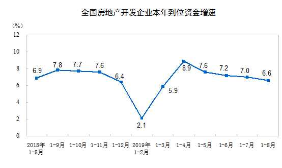 1—8月份,房地产开发企业到位资金113724亿元,同比增长6.6%,增速比1—7月份回落0.4个百分点。其中,国内贷款17322亿元,增长9.8%;利用外资81亿元,增长1.3倍;自筹资金36036亿元,增长3.1%;定金及预收款38377亿元,增长8.3%;个人按揭贷款17449亿元,增长11.8%