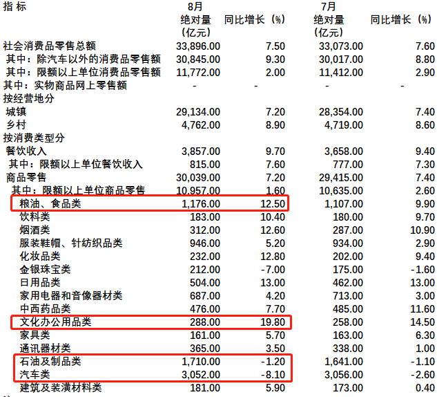 8月份,社会消费品零售总额同比增长7.5%,较7月份小幅下行0.1个百分点,符合预期。社会消费品零售总额其他项目较为稳定,近月来主要受汽车消费影响,增速波动较大,6月份汽车消费大幅反弹消耗了汽车消费潜力后,7-8月份汽车消费增速大幅下行,但是受相关商品涨价的影响,粮油、食品类商品8月份同比增速12.5%,环比增加了2.6%个百分点,实际上延缓了消费下行的速度;另外,受到学生开学的影响,办公用品类消费同比增长19.8%,环比增长了5.4%个百分点。预计受到9月中秋节及国庆节来临以及沙特油田事件的影响,9月份社零可能会出现些许反弹。